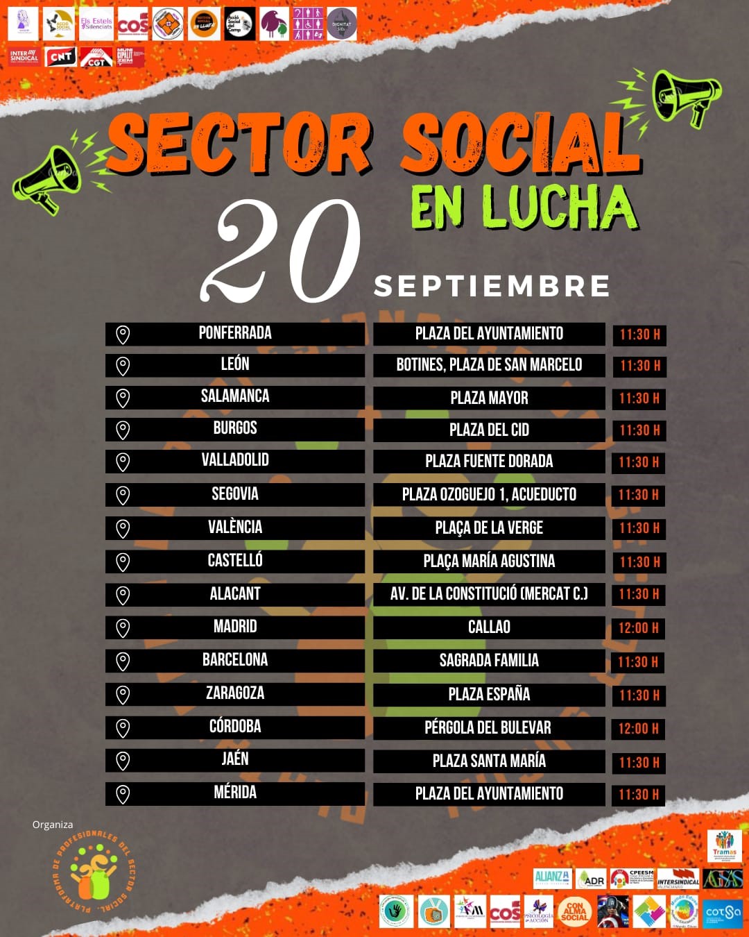 Se defiende que el foco no se dirija a etiquetar a colectivos o personas, alimentando discursos de odio, sino a transformar las condiciones laborales de los /as profesionales del sector social: cumplir y mejorar los mínimos legales y negociar nuevos Convenios Estatales, Autonómicos y normativas de las distintas Comunidades Autónomas, que mejoren condiciones de trabajo, que pongan fin a la inestabilidad que daña la salud de los/as profesionales y merma la calidad de la atención a quienes acompañan, porque !Sin derechos laborales no hay derechos sociales! (Extracto manifiesto concentraciones 20S)