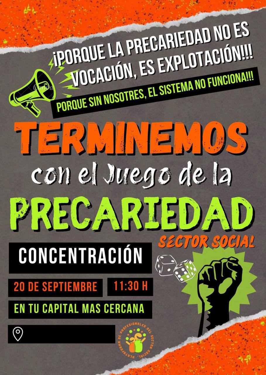 La Asociación Plataforma de Profesionales del Sector Social ha convocado concentraciones, con el lema “TERMINEMOS CON EL JUEGO DE LA PRECARIEDAD EN EL SECTOR SOCIAL” en diferentes provincias que tendrán lugar el 20 de septiembre a las 11:30 horas.