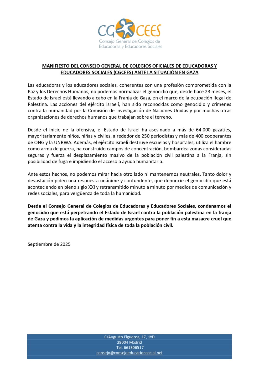 Manifiesto del CGCEES-Consejo General de Colegios Oficiales de Educadoras y Educadores Sociales ante la situación en Gaza. Acceso al Manifiesto
