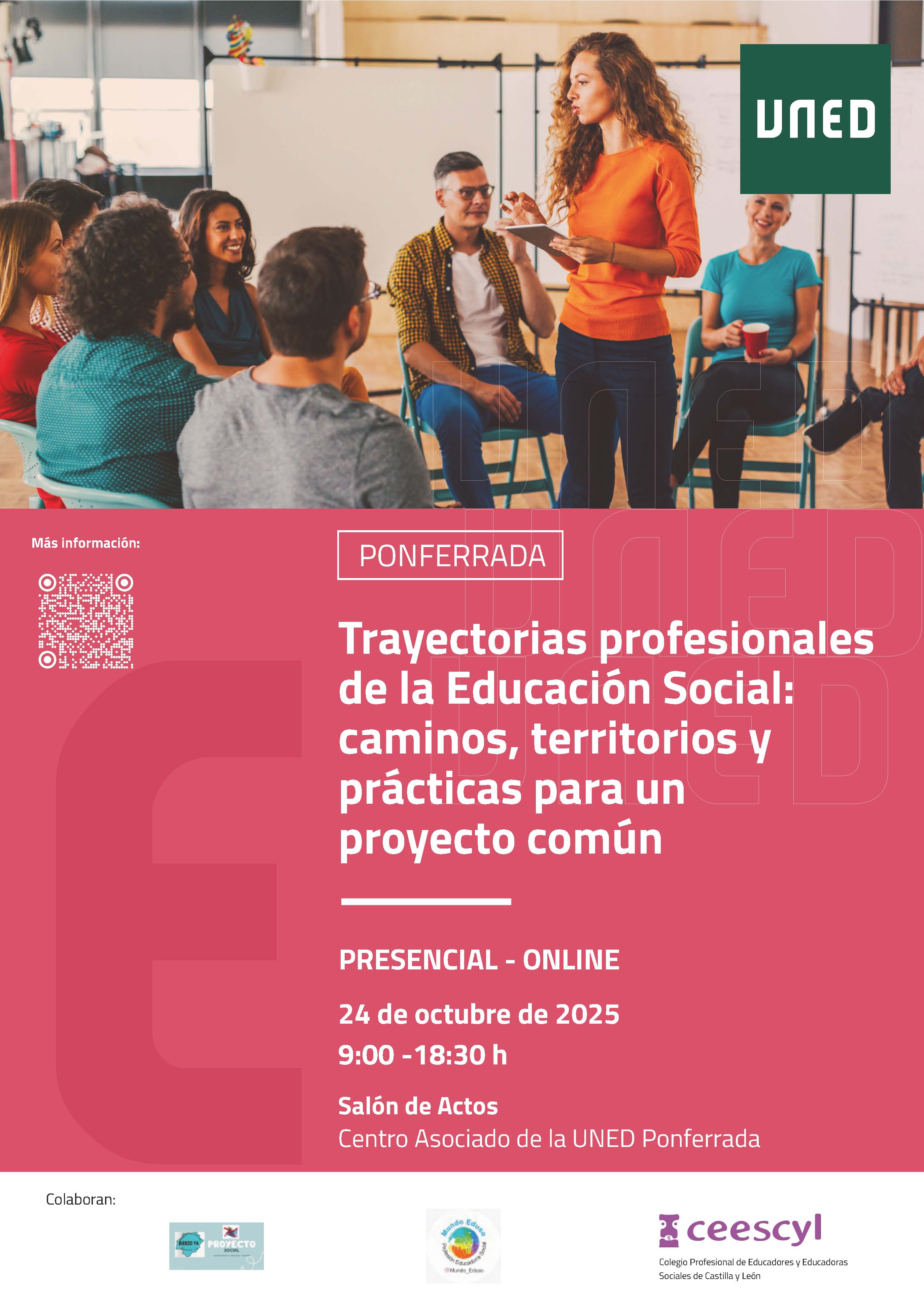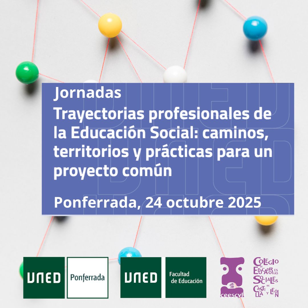 El Centro Asociado de la UNED en Ponferrada organiza, en colaboración con el Colegio Profesional de Educadores y Educadoras Sociales de Castilla y León (CEESCYL) la Jornada “Trayectorias profesionales de la Educación Social: caminos, territorios y prácticas para un proyecto común “, en el mes de la celebración del Día Internacional de la Educación Social y en el marco de las “Jornadas Institucionales UNED Educación Social 2025”.