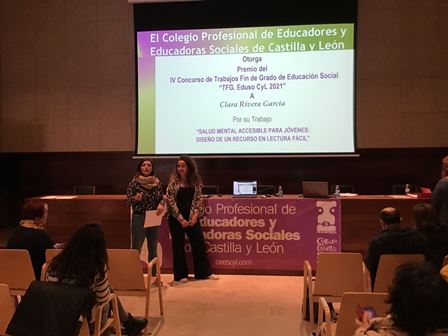 Al finalizar y en un emotivo acto, se hizo entrega del premio del IV CONCURSO TFG.EDUSOCYL 2021 a Clara Rivera García por su Trabajo Final de Grado titulado “Salud mental accesible para jóvenes: Diseño de un Recurso de Lectura fácil” (USAL).